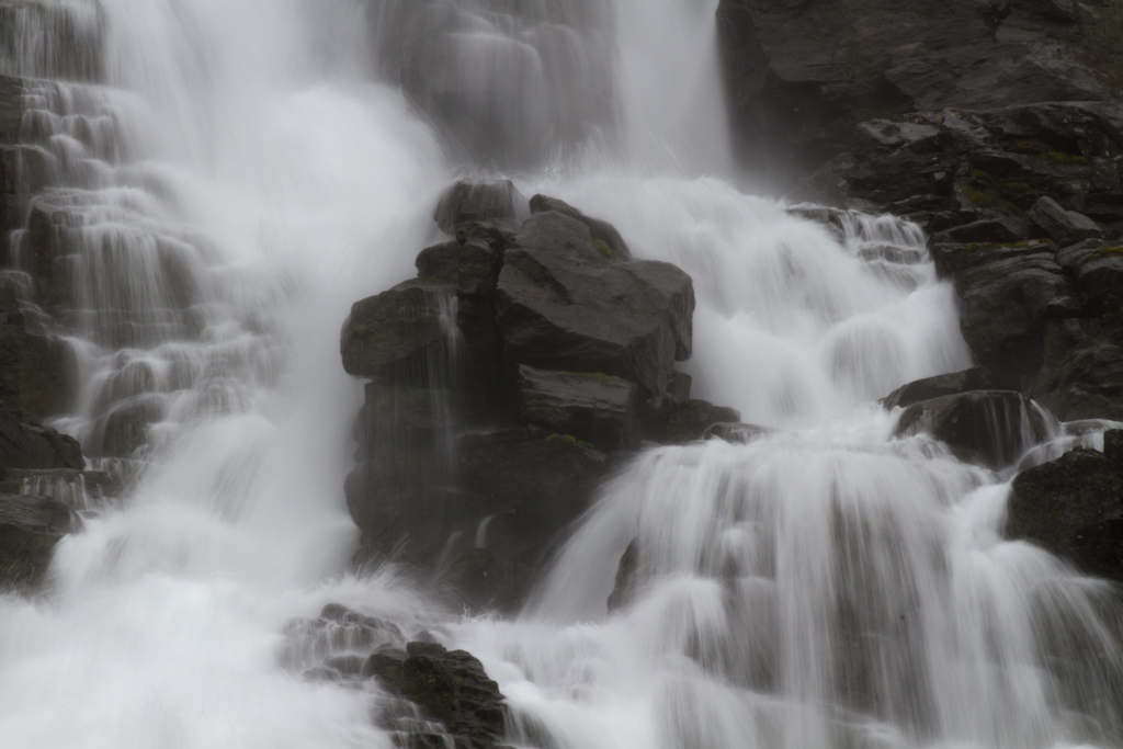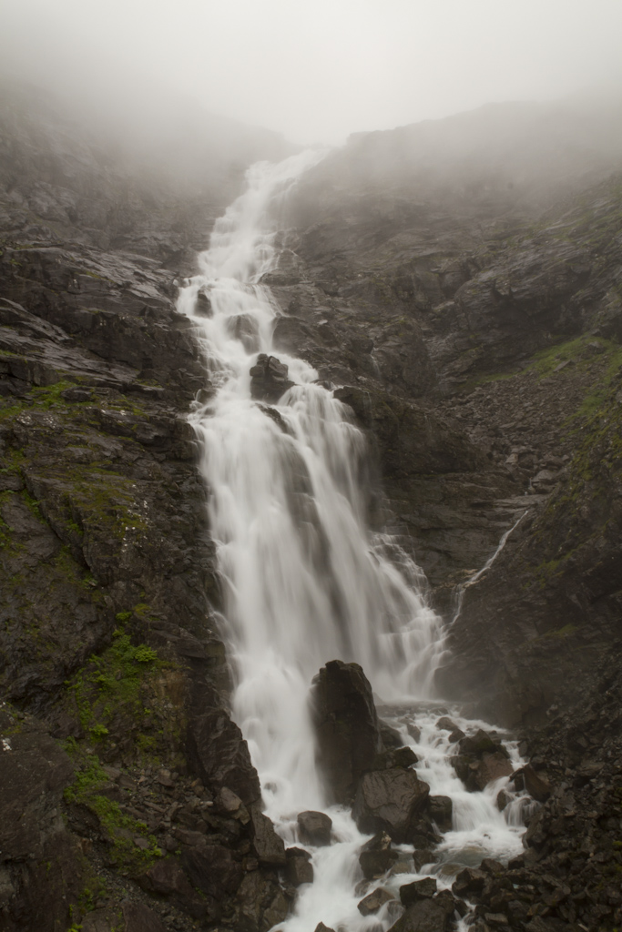 Trollstigeniä lähestyttäessä tie nousi ylös pilveen, eikä tuolta päältä sitten nähnyt yhtään mitään... Onneksi alas mennessä oli ihan näyttävän näköinen putous josta sain napsittua kuvia. Trollstigenin tietä on kehuttu, mutta ei tuo nyt ihmeellinen ole, muutama hiusneula ja hirvittävästi liikennettä (busseja ja matkailuautoja).